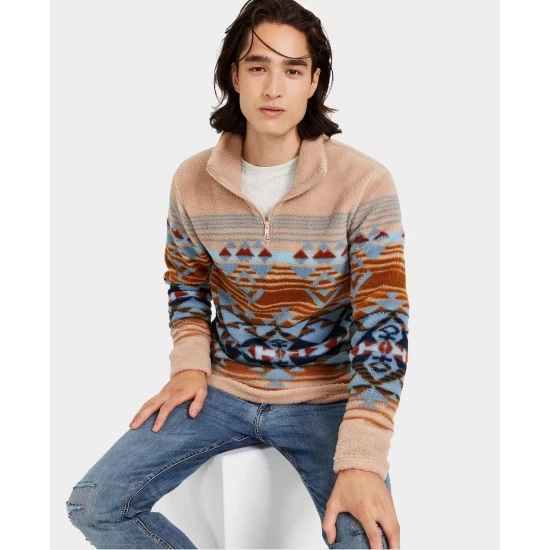Rich colorways, a vibrant pattern and sharp silhouette make this sweater from Sun + Stone a stylish option for those cooler days.