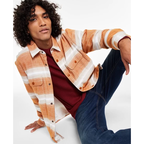 Stay stylish and warm for cool days and chilly nights with the bold stripes and sherpa-fleece lining of this comfortable Kip flannel shirt jacket from Sun + Stone.