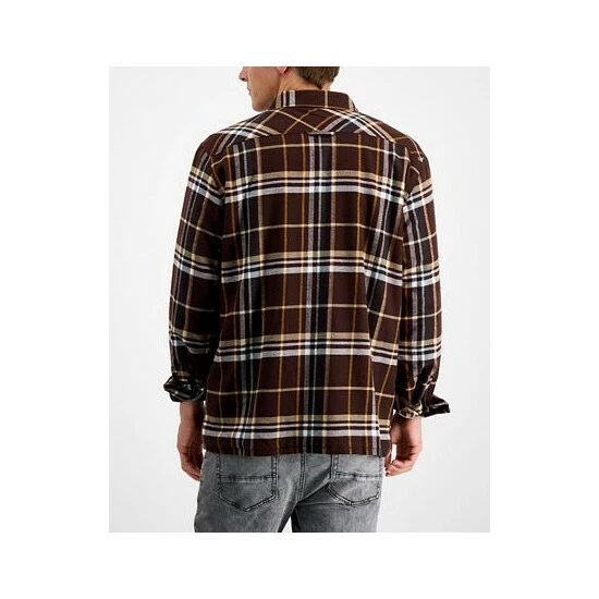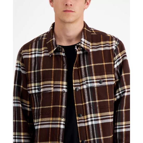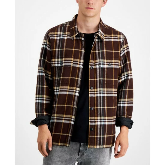 Relax in the smooth fabrication of this flannel shirt jacket from Sun + Stone, designed with a rich chocolate plaid design.