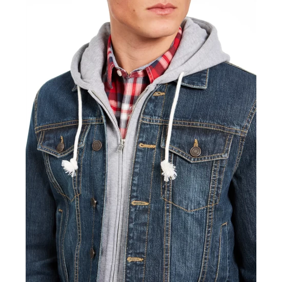 SUN + STONE freshens a classic casual style with the inner zip knit hood and rich outer jean feel of the Reeves Trucker Denim Jacket.