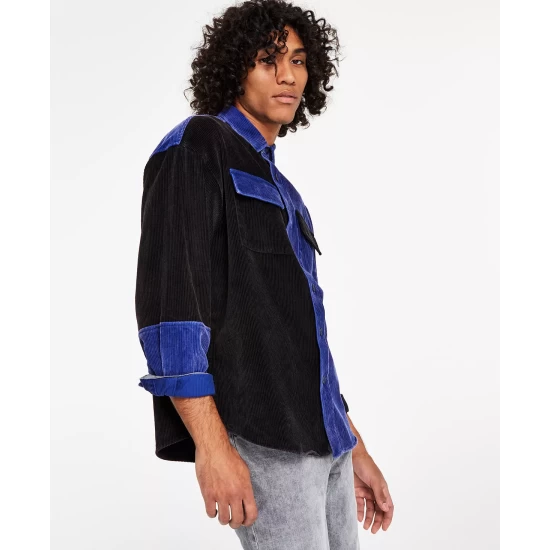 For a classic button-down with a contemporary twist, choose the pieced colorblocked styling of this comfy corduroy shirt from Sun + Stone.